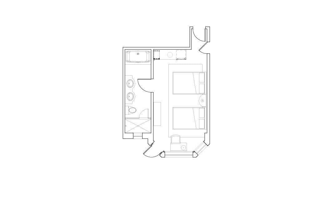 Each spacious 400 square foot studio features one bedroom with two beds, and one bath. Embodying a playful take on Palm Beach sophistication, our new room style is modern yet timeless. Views overlook the North or South courtyards. A selection of double bed guestrooms are available to connect to select suites.